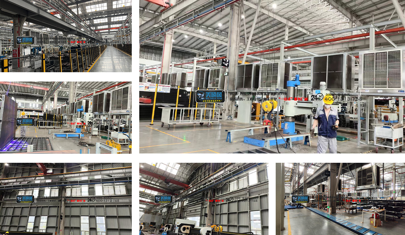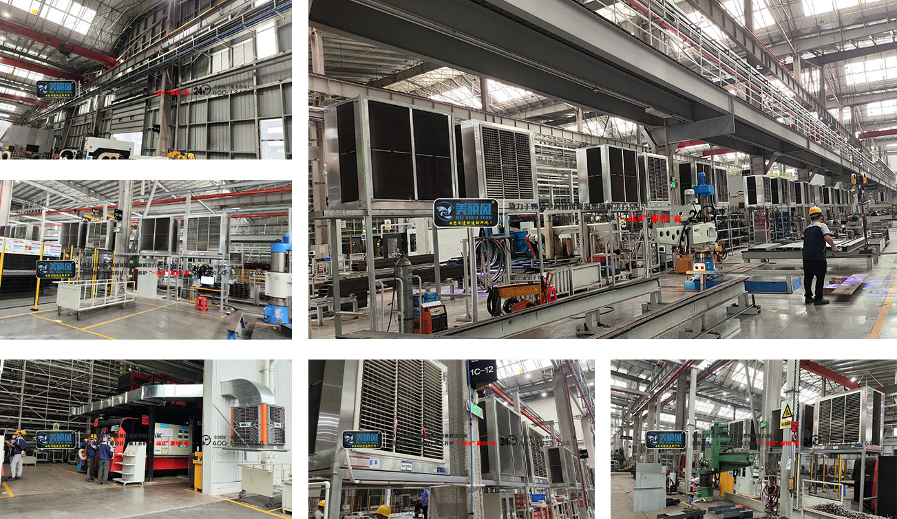 • 焊接区:“可移动排烟罩 + 蒸发式水帘冷风机” 组合,既通过排烟罩(排烟效率≥90%)精准捕捉焊接烟尘,又用冷风机定向降温 4-6℃,解决 “高温 + 污染” 双重痛点,且无积水不影响焊接质量。