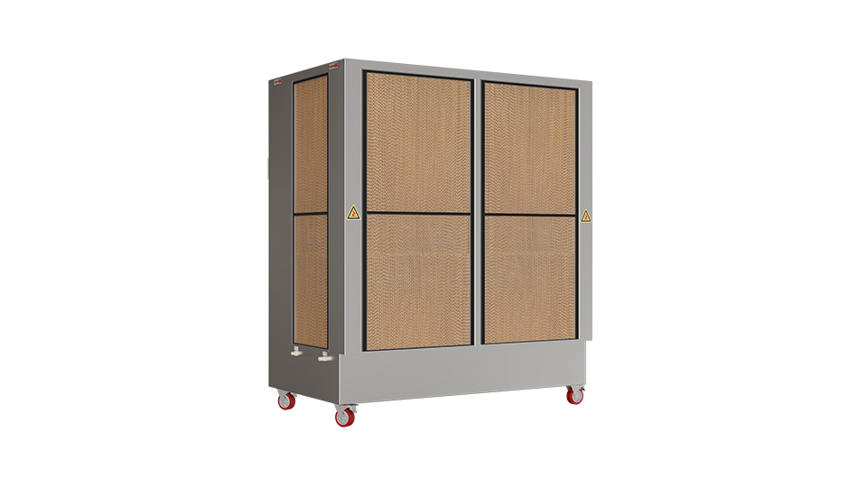 移动式水帘柜冷风机组,是降温系统一种新的结构形式,它融大面积湿帘与低转速大风 量负压风机为一体,蒸发效率高,降温效果好,覆盖面积大,出风柔和,是一款集降温、换 气、防尘、除味于一身的新款工业环保空调